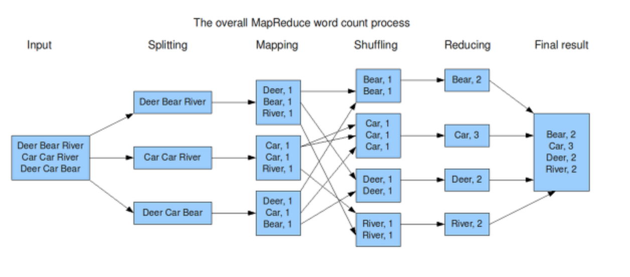 - mapping 이후 reducing 전에 suffling이라는 과정이 있다. mapping 결과로 key-value 형태의 데이터 더미를 각reduce task에게 적합한 형태로 전달해주기 위한 처리 과정이다.( 참고한 포스트마다 suffling의 포괄 범주가 다르다.. 아무튼 아래의 과정들은 mapping 이후 reducer에게 전달되기 전까지의 과정들이다.)