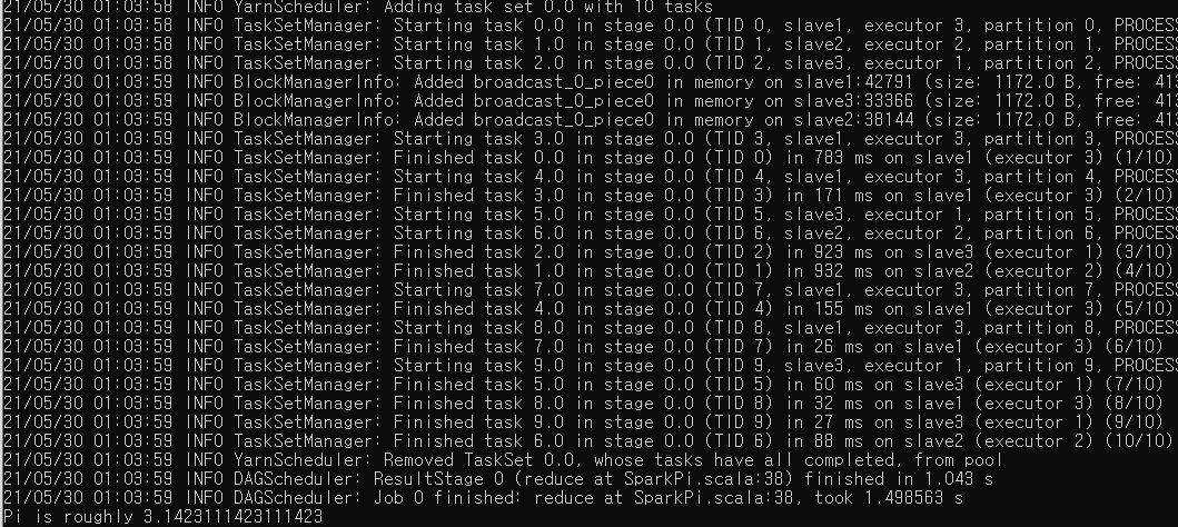 spark-submit --class org.apache.spark.examples.SparkPi --master yarn --deploy-mode client --num-executors 3 /usr/local/spark/examples/jars/spark-examples_2.11-2.2.2.jar 10